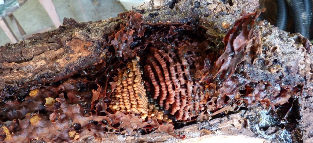 There are a few varieties that are called social bees, and these will form small nests of a few hundred workers and drones. While these bees don’t collect large quantities of honey like our introduced bees, they do take and store small amounts, and it tends to be more tasty and tangy. There is growing interest in developing techniques to keep the social bees and to harvest the honey, but if you come across them in the wild it is best not to try to collect the honey so as to preserve the nest.