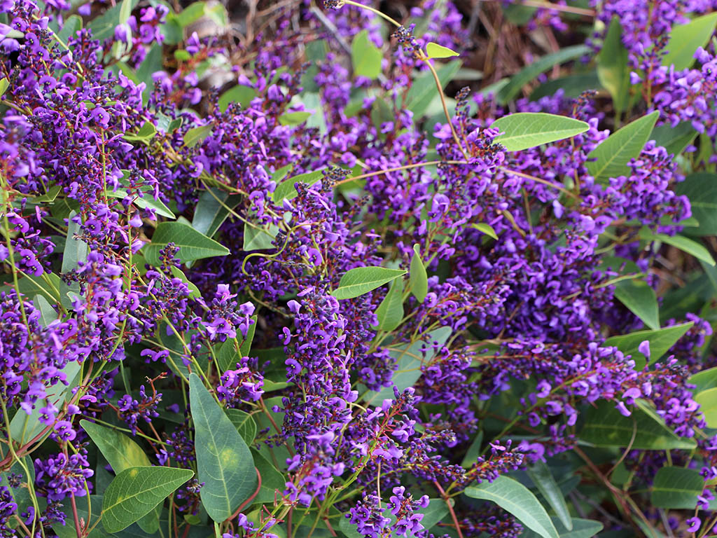 A tough and easy care climber or ground covering plant, this plant is spectacular when in flower, with many purple sprays of blossom. It blooms from spring through summer, and the plant fixes nitrogen from the air, which is good for the soil. It grows low to around 3 metres wide, and the dense habit smothers weeds once established, making it good for home gardens and larger landscapes. Also great for kids playgrounds. Low frost tolerance, drought tolerant, suits light clay to sandy soils, sun to part shade.