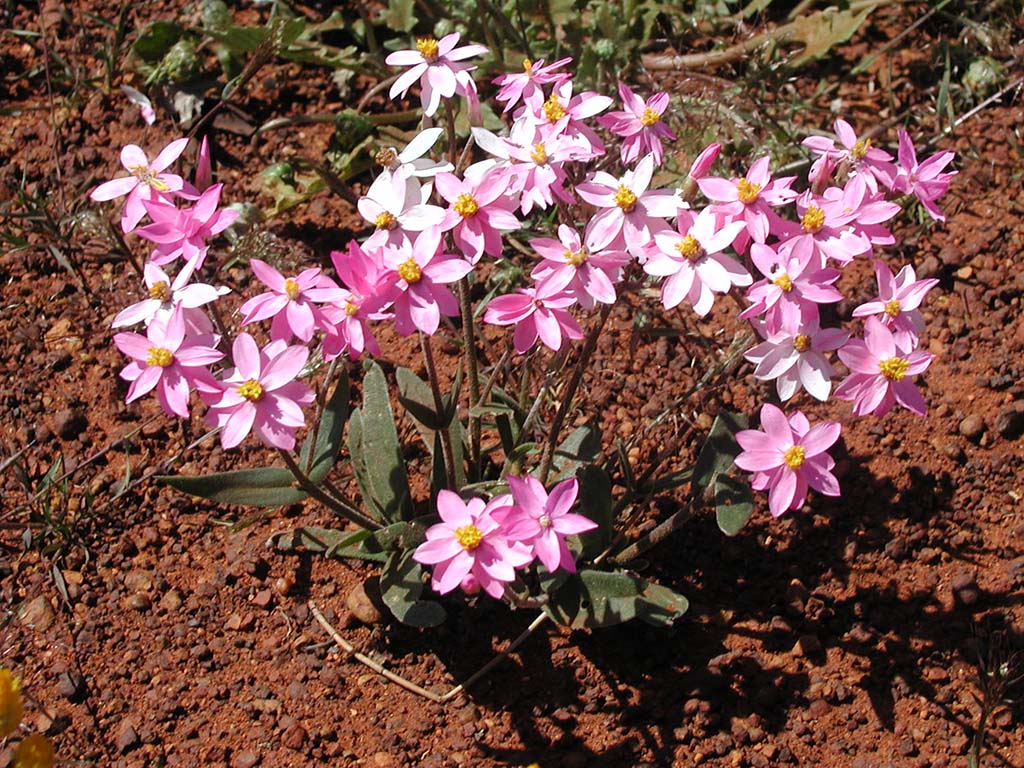 This delightful and showy everlasting daisy grows in a wide range of areas in Western Australia, and is one of the contributors to the tourist attracting wildflower display there every year after good autumn rains. An annual plant, it has furry leaves and stems and clusters of flowers with yellow centres surrounded by pink papery bracts in late winter, spring through to summer (depending on the time that seed is sown or when rain events trigger germination). Frost tender.